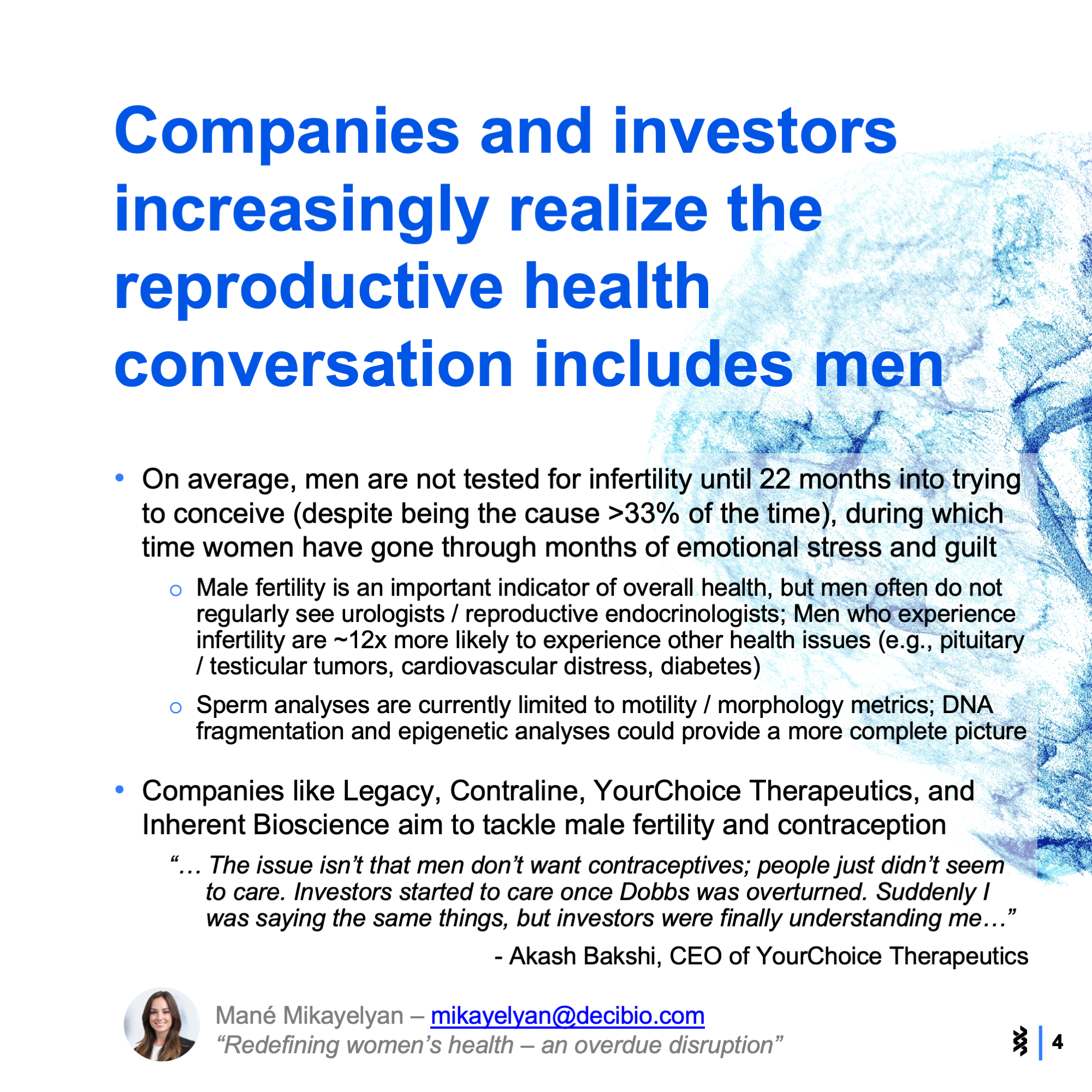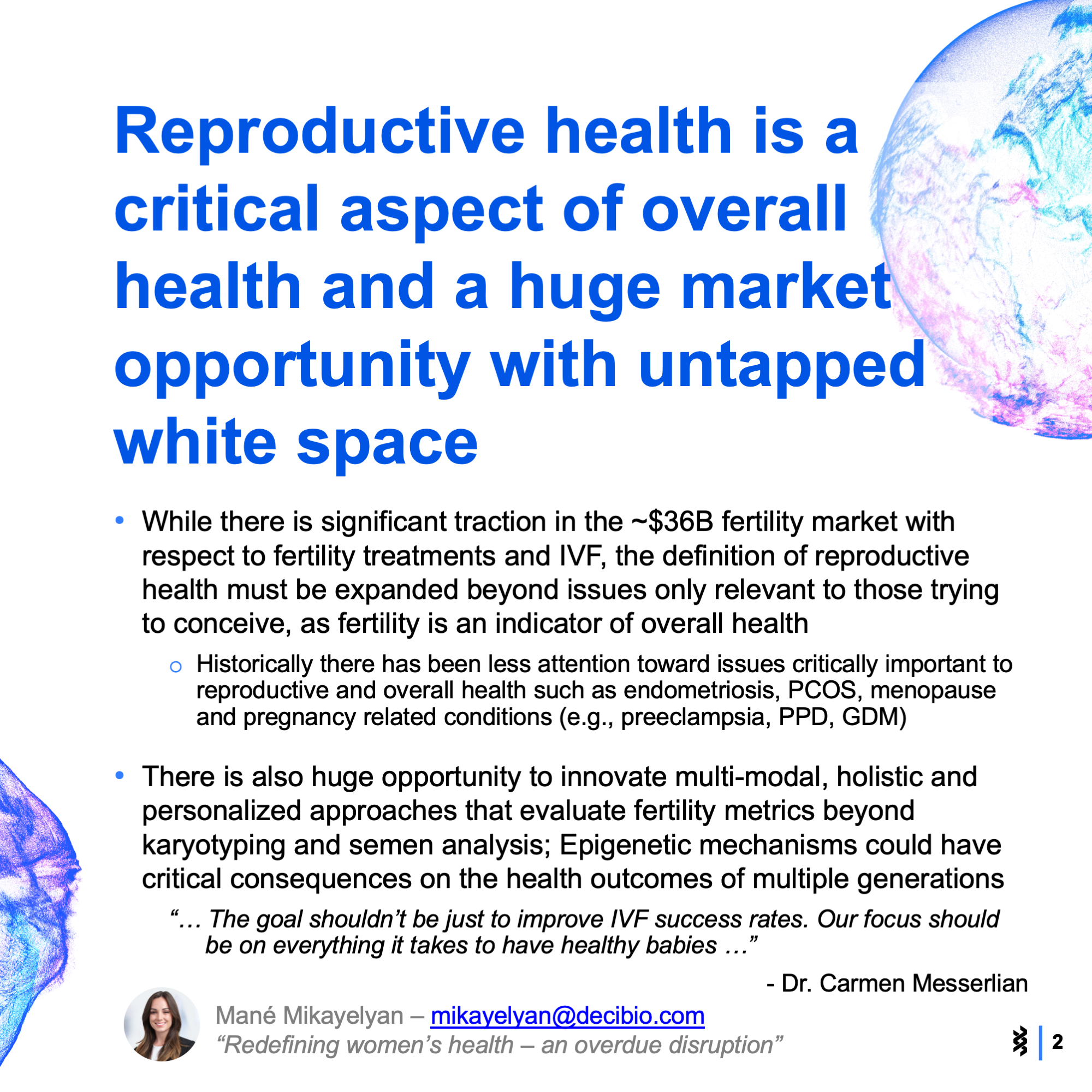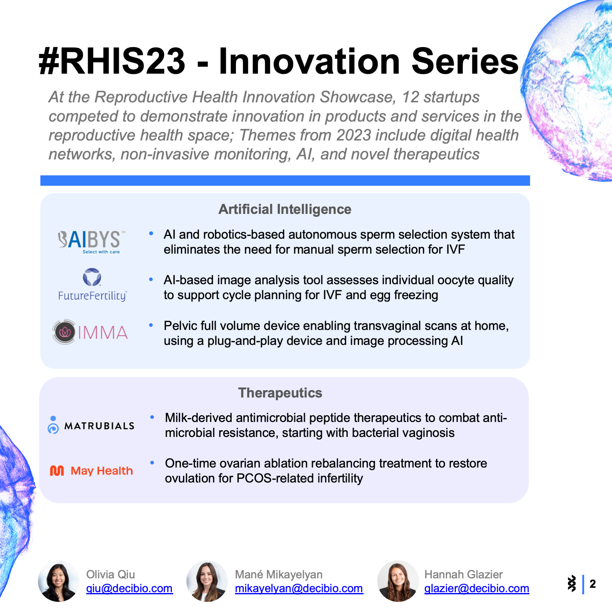 At the conference, 12 startups competed to demonstrate their contribution to innovation in the reproductive health space. The themes and categories included digital health networks, non-invasive monitoring, AI and novel therapeutics. Check out the slide show below to see the main takeaways that stood out to us.