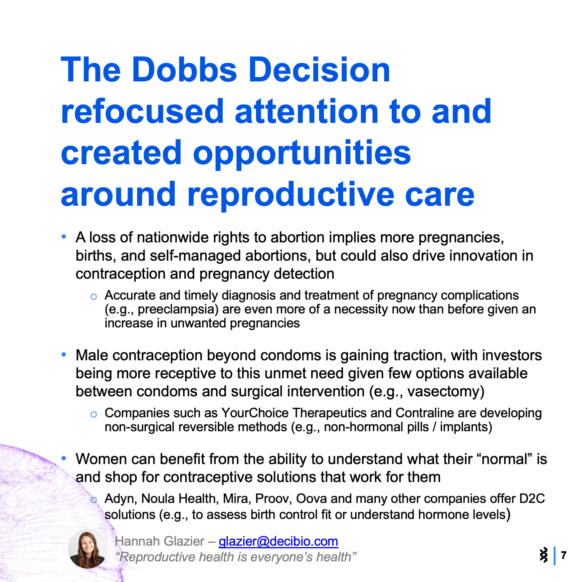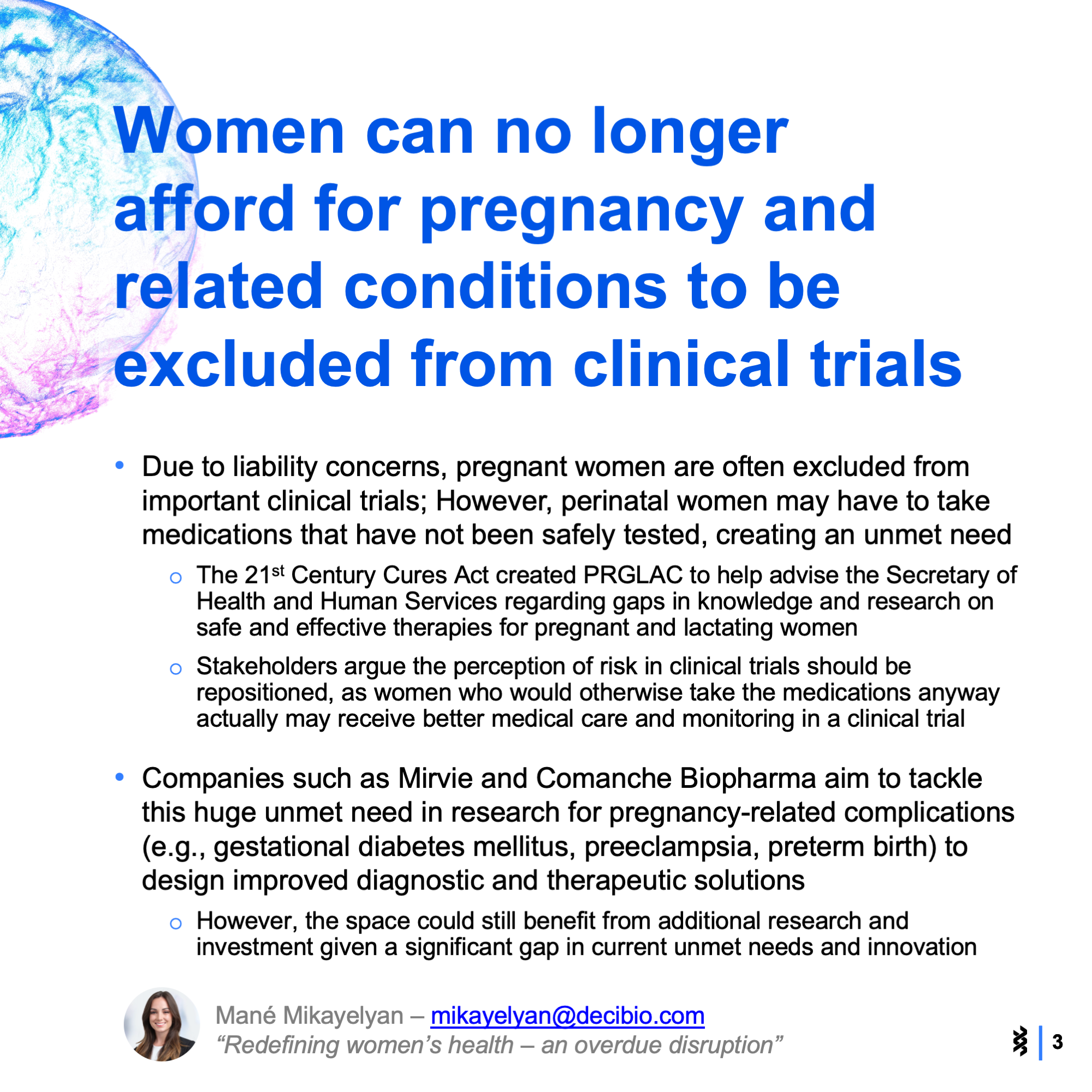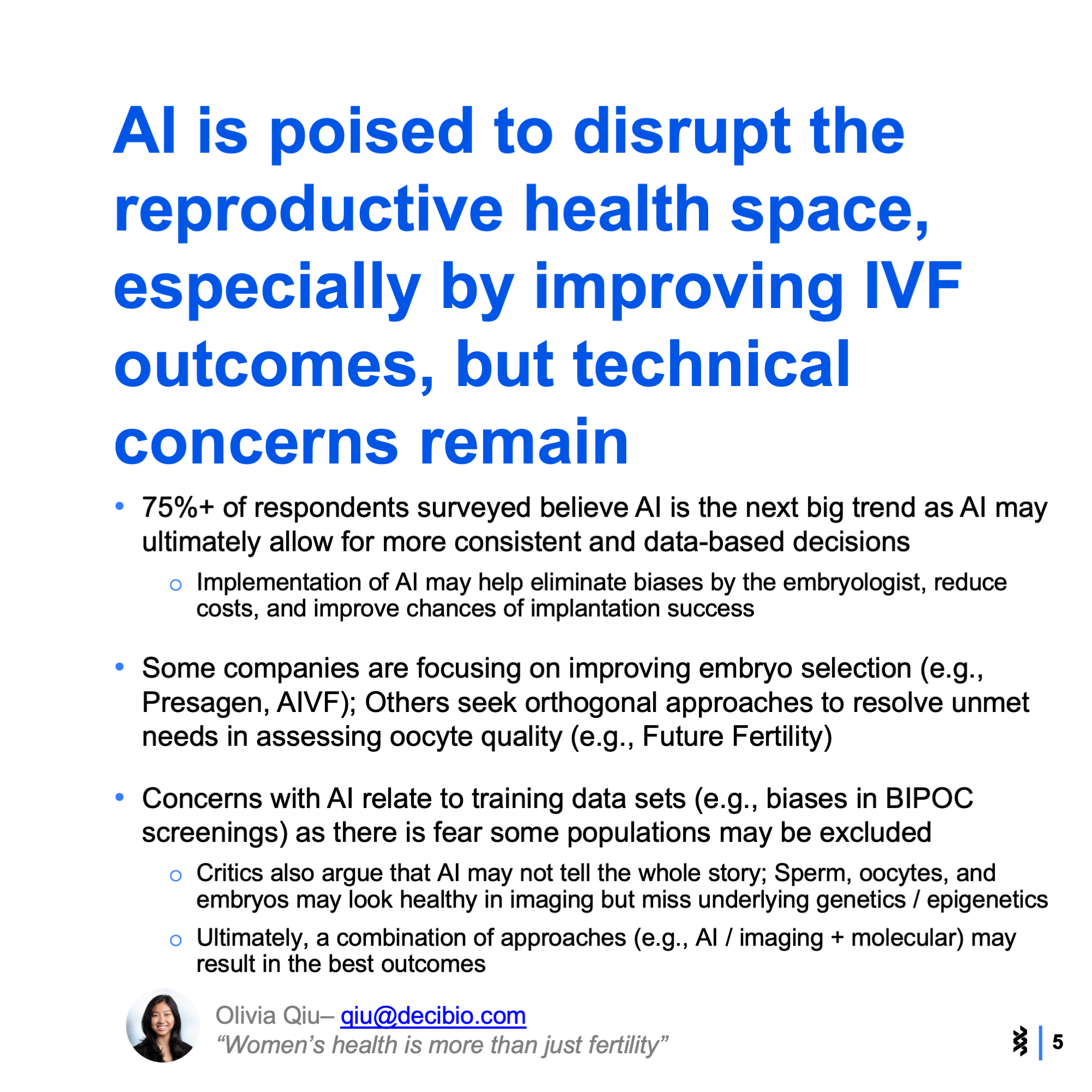 At the conference, 12 startups competed to demonstrate their contribution to innovation in the reproductive health space. The themes and categories included digital health networks, non-invasive monitoring, AI and novel therapeutics. Check out the slide show below to see the main takeaways that stood out to us.