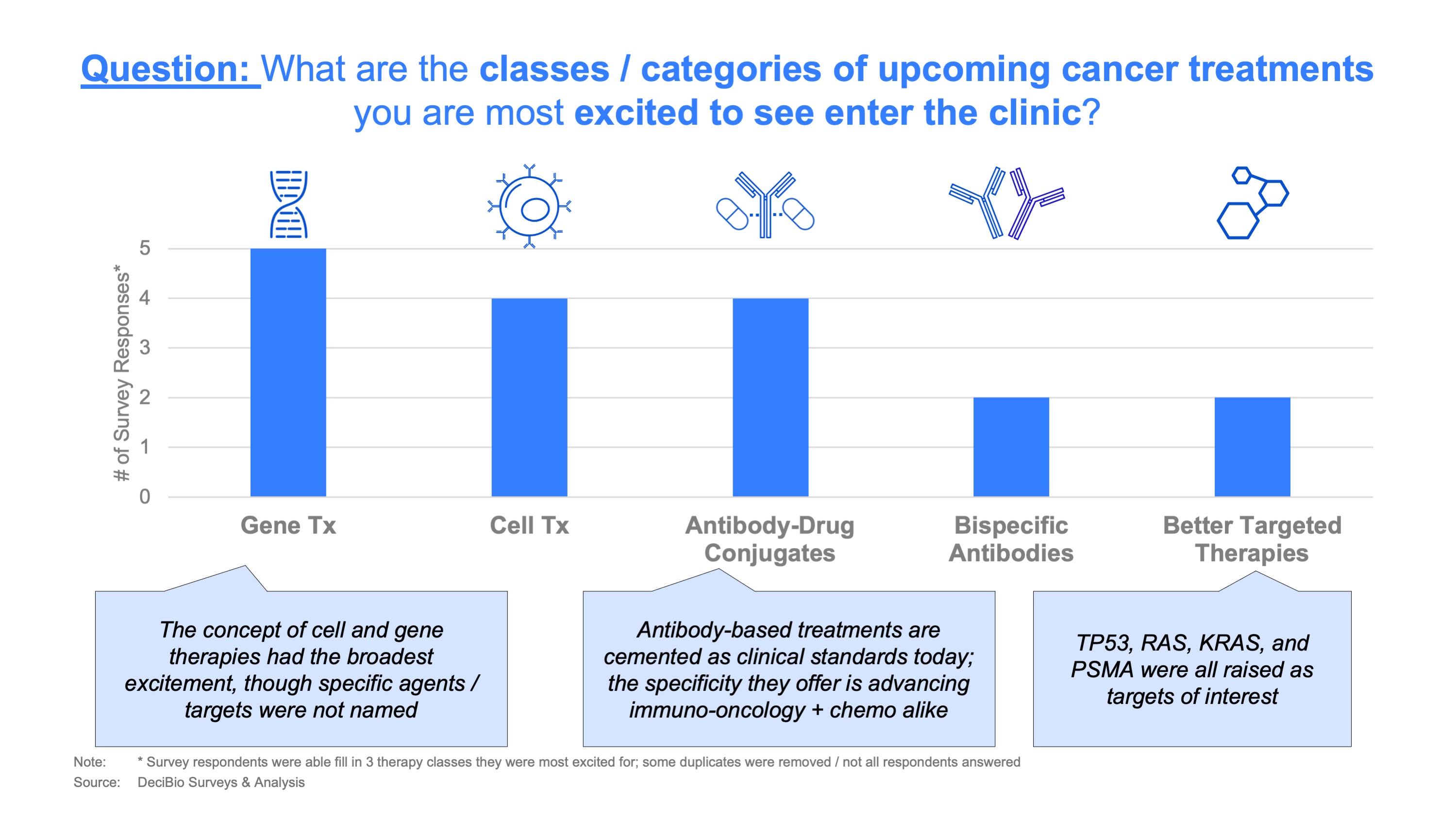 · Among treatments, personalized cell and gene therapies were cited as the most exciting to surveyed oncologists. Next generation TKIs were also top of mind in light of near ubiquitous access to genomic testing and the expansion of targeted therapies into earlier stages of disease / adjuvant settings.