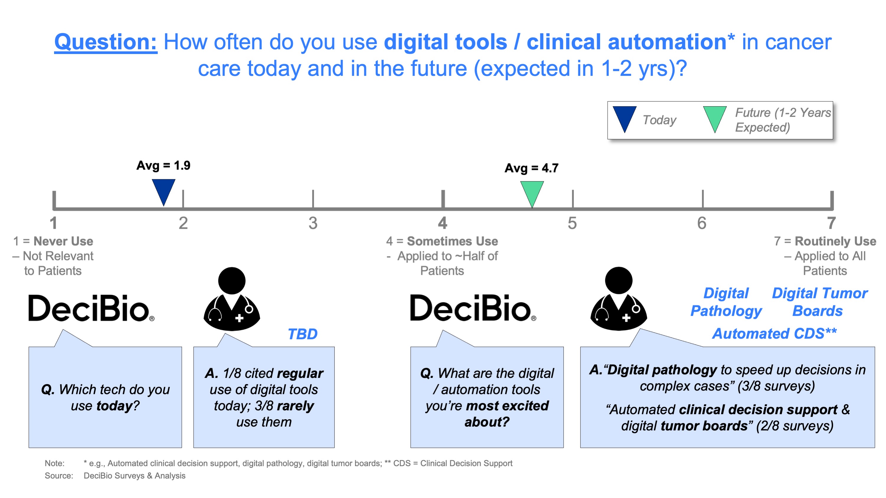 · Only ~half of surveyed oncologists cited they use digital tools / clinical automation solutions today, but those who did use them still only applied them to a minority of patients. In 1-2 years, most surveyed stakeholders think >50% their patients will benefit from these tools, with digital pathology and automated clinical decision support solutions seeing greatest interest.