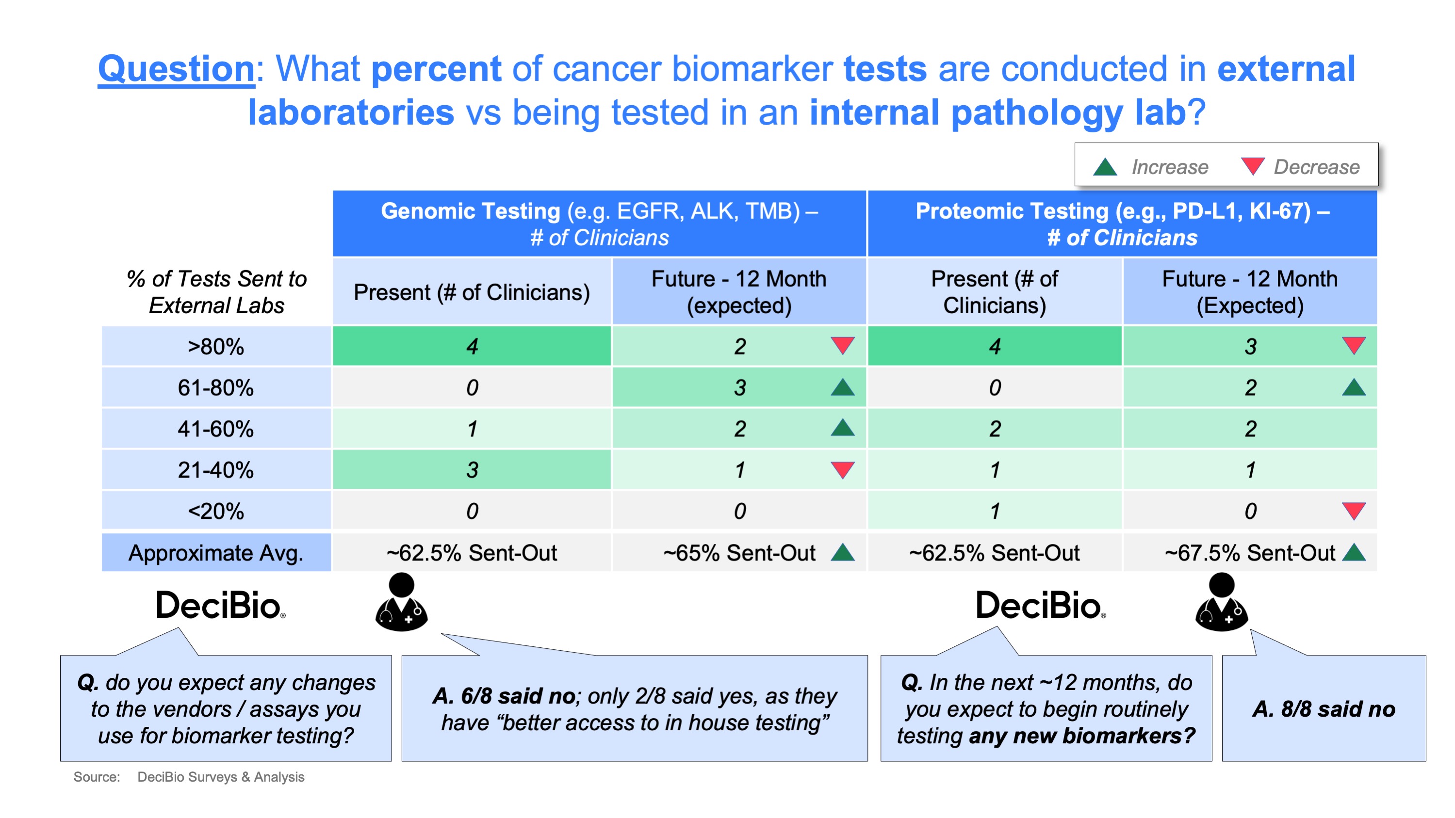 · For both proteomic and genomic testing, 3/8 oncologists expect more tests to be sent to external labs, 3/8 expect no change, and only 2/8 expect to bring more testing in-house over the next ~12 months.